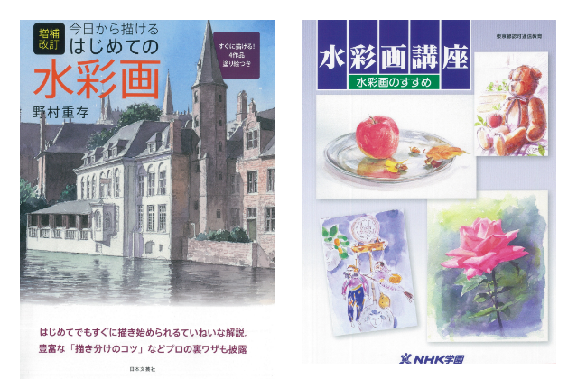 この通信講座の講師である野村先生が執筆した「今日から描けるはじめての水彩画」とNHK学園オリジナルのサブテキストの2冊を使って学んでいきます。